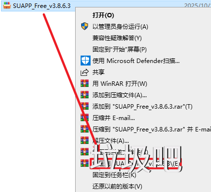 2.打开刚刚解压的文件夹,选中“SUAPP_Free_v3.8.6.3”文件,右击选择“以管理员身份运行”