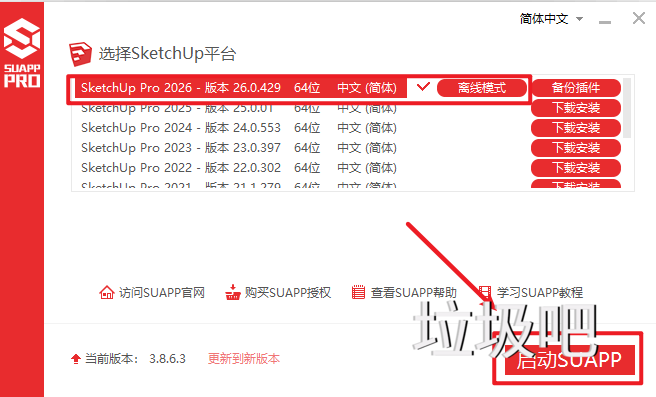 5.根据安装的SketchUp(草图大师)版本进行选择,点击“云端模式”切换成离线模式“,点击“启动SUAPP”